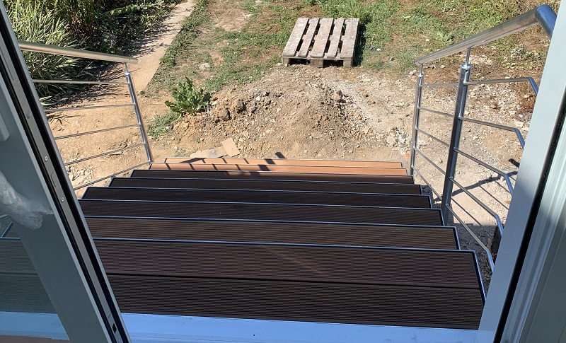 Aussentreppe aus Stahl feuerverzinkt mit Holzstufen und beidseitigem Geländer (von oben fotografiert)