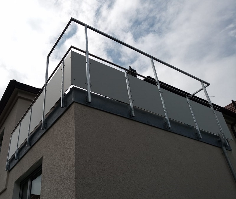 Balkongeländer aus feuerverzinktem Stahl mit Edelstahlhandlauf, Trespa Meteon Platten und Wäscheleine