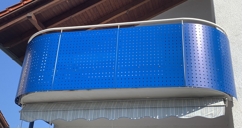 Individuelle Lochbleche in blauer Pulverbeschichtung als Balkongeländerfüllung